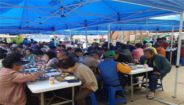 경기 수원시 권선구는 지난 16일 세류2동 문화경로당 옆 공원에서 ‘참! 맛있는 행복밥차’를 운영했다. 사진은 행사에 참여한 노인들이 맛있게 식사를 하는 모습.(사진제공=권선구청)