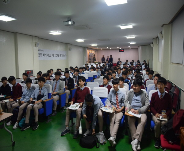 최근 서울 은평구립도서관이 서울대성고등학교에서 ‘신종 바이러스, 왜 인간을 공격하는가?’란 주제로 <바이러스 쇼크>의 저자 최강석 교수를 초빙해 찾아가는 과학 강연을 실시했다. 사진은 강연을 듣고 있는 학생들의 모습.(사진제공=은평구립도서관)