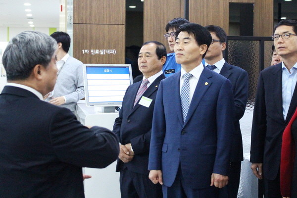 안성화 서울 송파구의장이 최근 구청 보건소 1층에서 열린 '송파건강관리센터' 개소식에 참석해 현판 제막식 후 관계자의 설명을 청취하고 있다. 이날 안 의장은 진료실부터 회의실까지 주민 편의중심의 맞춤형 서비스 시설물로 새롭게 단장한 송파건강관리센터를 둘러봤다.(사진제공=송파구의회)