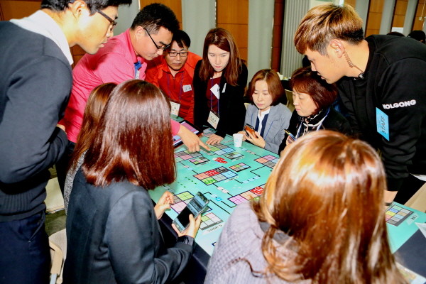 금천구는 오는 25일까지 (주)놀공발전소와 함께 300명의 직원을 대상으로 ‘놀 듯이 공부하는 게임기반 교육’을 실시한다. 사진은 지난 17일 직원들이 기업 환경을 축소시켜 모바일과 디지털 기기, 보드판 등을 활용해 직접 사업을 운용하는 ‘모막(MoMAK)’ 게임을 하는 모습.(사진제공=금천구청)