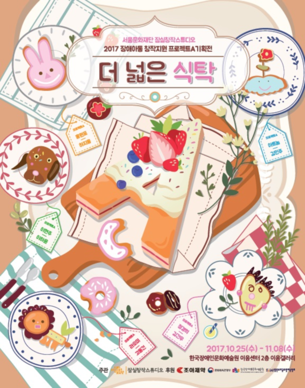 ‘더 넓은 식탁’이란 주제로 진행되는 이번 전시회는 라오미-고동건(지적장애), 아트놈-김민주(언어장애), 이현주-이하윤(자폐성장애), 정경희-김건우(다운증후군), 홍원표-하지웅(자폐성장애)으로 구성된 멘토-멘티 등의 작품 50여점이 전시된다.