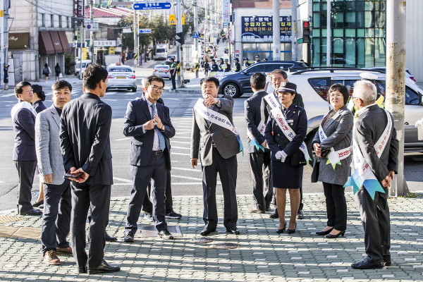 인천 계양구는 지난 19일 계산초등학교 앞에서 어린이 교통사고 예방 및 안전한 통학로 확보를 위한 ‘시민단체와 연계한 교통사고 줄이기(교통안전) 캠페인’을 실시했다. 사진은 박형우 구청장(가운데)이 관계자들과 함께 통학로를 살펴보는 모습.(사진제공=계양구청)