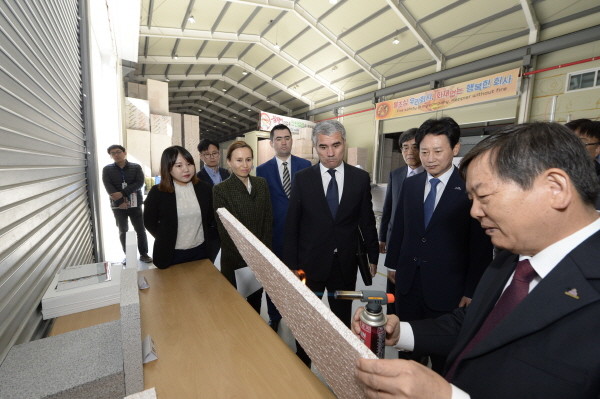 김종천 경기 포천시장은 지난 19일 난연 제품을 개발·생산·공급하고 있는 지역내 업체인 (주)쉘보드 기업을 현장 방문했다. 사진은 김 시장(오른쪽 두번째)이 회사 관계자로부터 난연 제품의 내구성에 대한 설명을 듣고 있는 모습.(사진제공=포천시청)