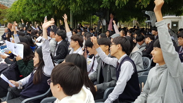 경기 부천교육지원청은 지난 18일 오후 2시 부천중앙공원에서 ‘청소년 독서 어울림 수Book수book’ 독서행사를 개최했다. 사진은 행사에 참여한 학생들이 질문하기 위해 손을 들고 있는 모습.(사진제공=부천교육지원청)