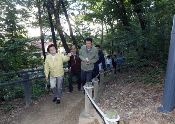지난 20일 신연희 서울 강남구청장이 재난 취약지역인 수서청소년수련관 절개지 일대 현장 점검을 실시했다. 사진은 취약지역을 방문해 현장을 둘러보며 관계직원과 이야기를 나누고 있는 신 구청장의 모습.(사진제공=강남구청)