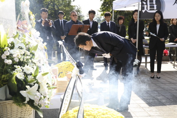 성동구는 지난 21일 오전 11시 성수대교 북단 IC 인근 성수대교 붕괴사고 위령탑에서 ‘제23주기 성수대교 붕괴사고 희생자 합동위령제’를 개최했다. 사진은 위령제에 참석한 정원오 구청장이 위령탑에 헌화하는 모습.(사진제공=성동구청)