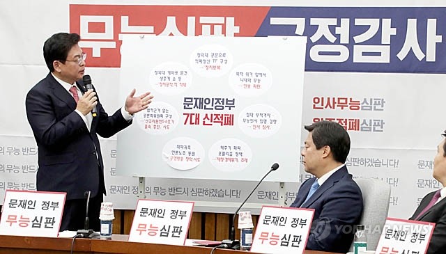 자유한국당 정우택 원내대표가 23일 오전 국회에서 열린 국정감사 대책회의에서 차트를 만들어 정부 정책을 비판하고 있다.