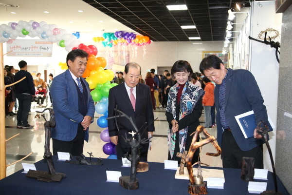 지난 23일 오후 박홍섭 마포구청장(왼쪽에 두번째)이 구청 1층 로비에서 열린 제7회 마포장애인종합복지관 작품전시회 '우리가족 예술로 떠나는 여행'에 참석해 작품들을 감상하고 있다.(사진제공=마포구청)
