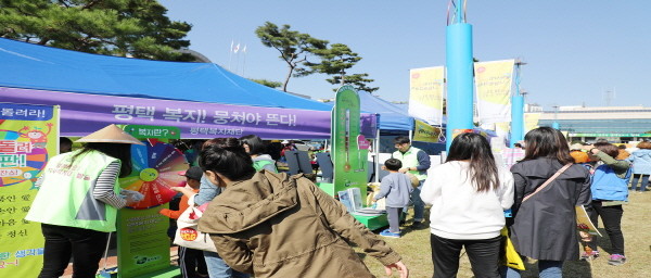 경기 평택시는 최근 시청 앞 광장에서 지역내 사회복지시설, 단체 종사자 및 관계자를 비롯한 시민 등 5000여명이 참여한 가운데 '제18회 사회복지의 날' 기념 ‘2017 평택시민나눔문화축제’를 개최했다. 사진은 시민들이 사회복지 홍보 부스를 구경하는 모습.(사진제공=평택시청)