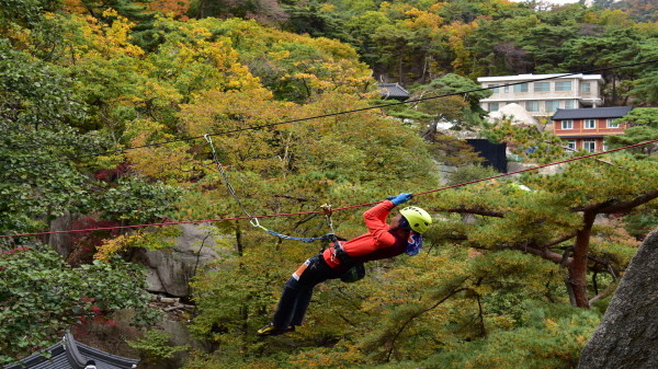 도봉구가 지난 21~22일 양일간 천축사와 부엉이바위 일원에서 자연암벽등반대회를 주제로 개최한 ‘제1회 국제 도봉산 페스티벌’이 성황리에 마무리됐다. 사진은 ‘티롤리안 브릿지 어센딩’ 대회 참가자가 경기에 참여하고 있는 모습.(사진제공=도봉구청)