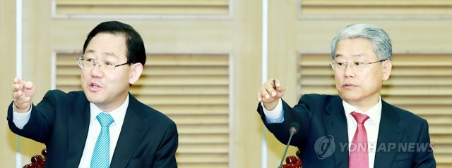 바른정당 주호영 당대표 권한대행 겸 원내대표(왼쪽)와 국민의당 김동철 원내대표가 25일 오전 국회 의원회관에서 열린 국민통합포럼 '소득 및 혁신 주도 VS 금융 주도 성장 비교' 행사에 참석해 같은 곳을 가리키고 있다.