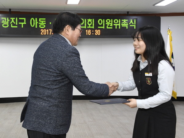 광진구는 지난 24일 구청 기획상황실에서 아동·청소년의회 의원 47명을 대상으로 '2017 광진구 아동·청소년 의회 의원 위촉식'을 개최했다. 사진은 위촉식에 참석한 김기동 구청장이 청소년의원과 악수하는 모습.(사진제공=광진구청)
