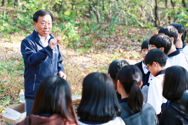 지난 25일 경기 안산시 성포동 노적봉공원에서 중앙중학교 1학년 학생 30여명을 대상으로 ‘숲 체험교육’이 진행됐다. 사진은 1일 강사로 나선 제종길 시장이 참가 학생들에게 숲이 사람에게 주는 이로움에 대해 설명하고 있는 모습.(사진제공=안산시청)