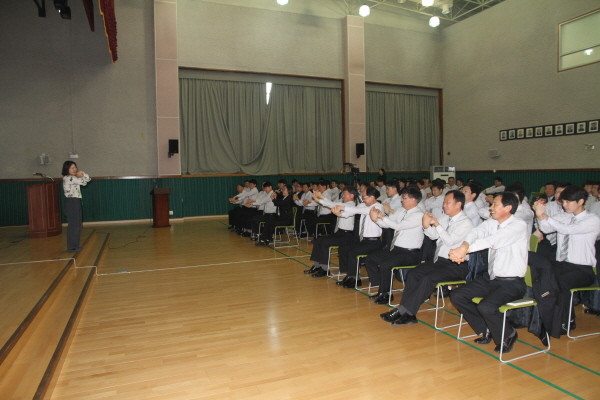 지난 25일 서울 은평소방서가 소방서 4층 대강당에서 직원 100여명을 대상으로 소통과 융화를 위한 직장교육을 실시했다. 사진은 글로벌사이버대학교 하나현 교수(상담심리학과)의 강의를 듣고 있는 직원들의 모습.(사진제공=은평소방서)