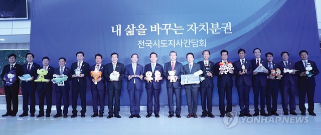문재인 대통령과 각 시·도 지사들이 26일 오전 전라남도 여수시 여수엑스포에서 열린 제2회 시도지사 간담회에서 각 시·도 마스코트를 들고 기념촬영하고 있다. 왼쪽부터 이춘희 세종시장, 김기현 울산시장, 권선택 대전시장, 윤장현 광주시장, 전성수 인천 부시장, 권영진 대구시장, 서병수 부산시장, 박원순 서울시장, 김관용 경북지사, 문 대통령, 남경필 경기지사, 최문순 강원지사, 이시종 충북지사, 안희정 충남지사, 송하진 전북지사, 이재영 전남지사 대행, 한경호 경남지사 대행, 원희룡 제주지사.