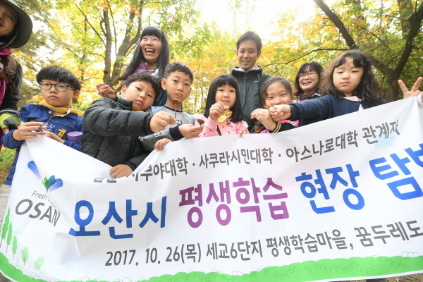 일본 시부야대학과 사쿠라시민컬리지, 아스나로대학 관계자들은 26일 경기 오산시 소재의 생동감평생학습마을과 물향기수목원, 시민참여학교 등 지역내 평생교육 현장을 방문했다. 사진은 물향기수목원을 방문한 관계자들이 기념촬영을 하는 모습.(사진제공=오산시청)