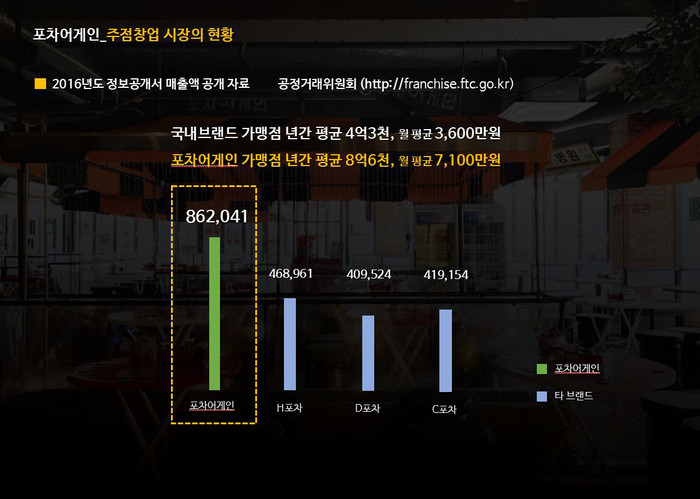 공정거래위원회의 가맹사업거래 관련 공개 자료에 따르면 포차어게인의 작년 가맹점당 연간 평균 매출(862,041,000원 /월 평균 71,000,000원)은 포장마차 테마 주점 가운데 가장 대중적인 인지도를 확보하고 있는 대형 포장마차 프랜차이즈 ‘H포차’(468,961,000원)보다 4억 원 가까이 높았고, 동종 브랜드 가운데 대표 브랜드로 꼽히는 업체들보다 2배 이상의 연평균 매출을 기록했다.