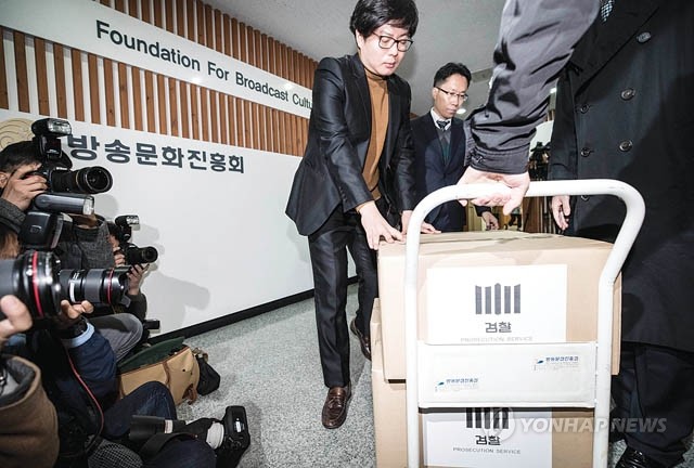 이명박 정부 시절 국가정보원이 공영방송 장악을 위한 공작을 벌였다는 의혹을 수사하는 검찰이 서울 여의도 방송문화진흥회에 대한 압수수색을 마친 후 압색물을 가지고 나오고 있다.