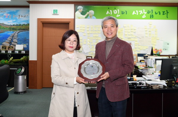 경기 오산시는 지난 30일 ‘민선6기 제33대 1일 명예시장’으로 세마동 지역사회보장협의체 위원인 김금옥씨(41·여)를 위촉했다. 사진은 곽상욱 시장(오른쪽)이 시장 집무실에서 김 명예시장에게 위촉장을 수여한 후 함께 기념촬영을 하는 모습.(사진제공=오산시청)