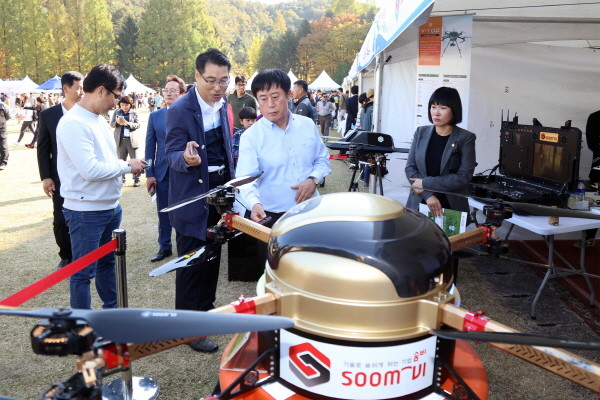 경기 용인시는 최근 기흥구 언남동 옛 경찰대학교 일대에서 5만5000여명의 관람객이 참여한 가운데 ‘드론페스티벌’을 개최했다. 사진은 행사장에 전시된 대형 드론을 살펴보고 있는 정찬민 시장(오른쪽에서 두 번째)의 모습.(사진제공=용인시청)