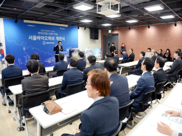 지난 30일 오후 4시 동대문구 회기로 117-3(회기동ㆍ구 농촌경제연구원 부지)에 있는 서울바이오허브 본관에서 ‘서울바이오허브’ 개관식이 열렸다. 사진은 행사에 참석한 유덕열 구청장이 인사말을 하는 모습.(사진제공=동대문구청)