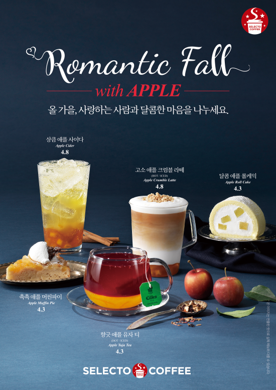 셀렉토커피의 관계자는 “가을철 대표 과일인 사과를 활용한 색다른 맛과 향을 지닌 음료와 디저트 메뉴는 후각과 미각은 물론 시각까지 만족스러울 것”이라며 “여기에다 취향에 따라 골라 마실 수 있는 셀렉토커피의 다섯 가지 아메리카노와 함께 가을의 낭만과 정취를 음미하시길 바란다”고 말했다.