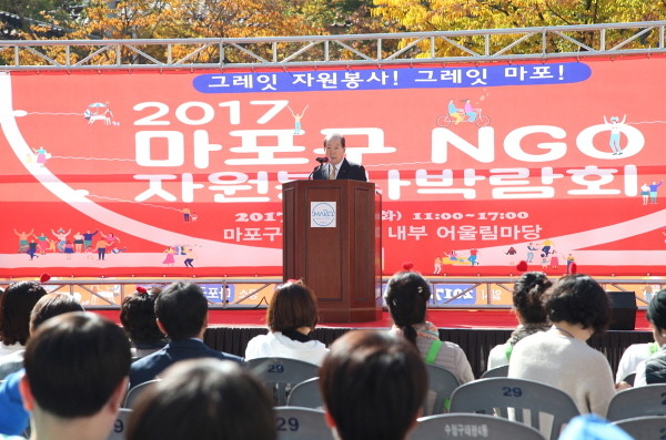 마포구는 지난 31일 구청 광장에서 '2017 마포구 NGO 자원봉사박람회 및 공익바자회'를 개최했다. 사진은 행사에 참석한 박홍섭 구청장이 인사말을 하는 모습.(사진제공=마포구청)