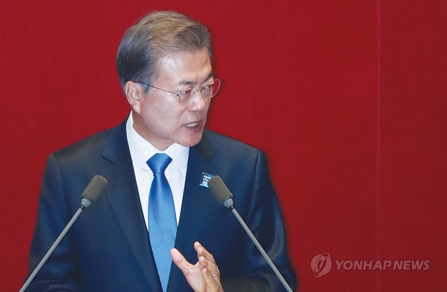 문재인 대통령이 1일 오전 서울 여의도 국회 본회의장에서 자유한국당 의원석 쪽을 바라보며 2018년도 예산안 관련 시정연설을 하고 있다.