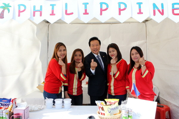 조동탁 서울 강동구의장(가운데)이 최근 천호중학교에서 열린 ‘제1회 강동 글로벌 문화체험 축제’에 참석해 국제적 감각을 두루 갖춘 글로벌 민주시민으로 자라나 달라는 당부의 말을 남겼다. 사진은 필리핀 문화 체험부스를 방문한 조 의장이 원어민들과 함게 기념포즈를 취하고 있는 모습.(사진제공=강동구의회)