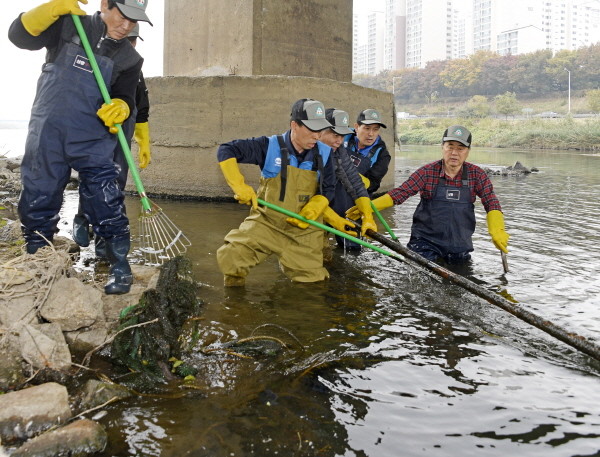 서울 광진구는 지난 2일 중랑천 체육공원과 건대역 사거리에서 25개 환경단체, 자원봉사자, 지역주민 등 400여명이 참석한 가운데 ‘광진 녹색거리 한마당’을 개최했다. 사진은 참여자들이 중랑천 생태환경보전행사를 진행 중인 모습.(사진제공=광진구청)