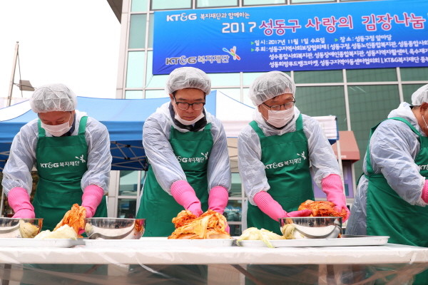 서울 성동구가 지난 1일 구청 광장에서 KT&G복지재단과 함께 추운 겨울을 대비해 지역내 소외계층의 따뜻한 겨울을 지원하자는 취지에서 ‘사랑의 김장나눔 행사’를 개최했다. 사진은 정원오 구청장(왼쪽 두번째)과 관계자들이 김장 소를 넣고 있는 모습.(사진제공=성동구청)