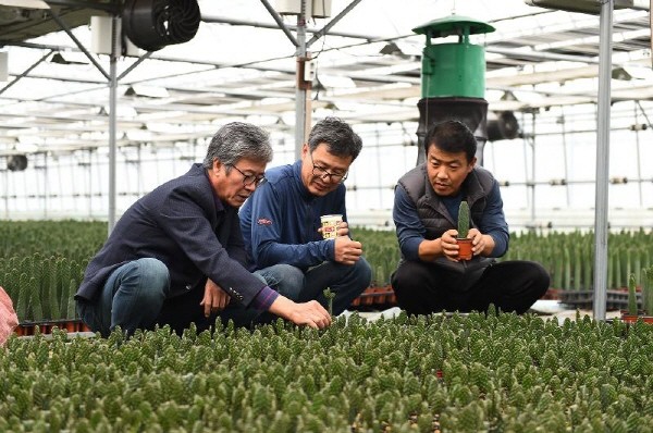 이대직 경기 여주시 부시장은 지난 2일 흥천면 다대리 화훼농가와 가남읍 연대리 세종어주 영농조합을 방문해 농정현장의 의견을 수렴했다. 사진은 화훼농가를 방문한 이 부시장(왼쪽) 등 관계자들이 선인장을 살펴보고 있는 모습.(사진제공=여주시청)