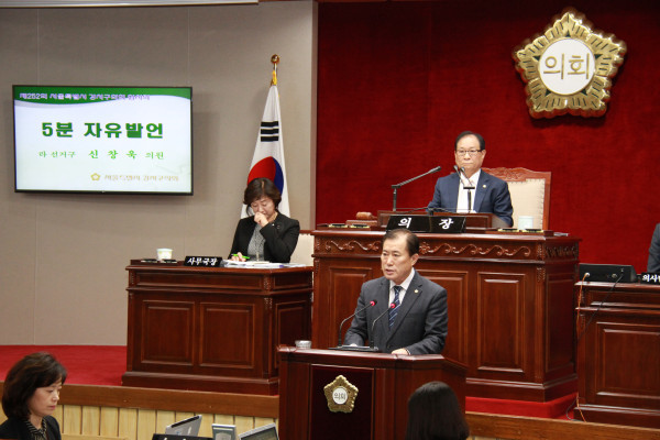 | ▲ 신창욱 강서구의원이 최근 열린 ‘제252회 임시회’에서 5분 자유발언을 통해 강서특수학교 설립을 촉구하고 있다.(사진제공=강서구의회) | ||