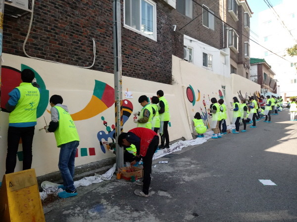 서울 은평구와 신사제2동주민센터가 사회복지 비정부기구(NGO) 단체인 ‘해피피플(HAPPY PEOPLE)’, 하나금융그룹 직원·가족, 신사제2동 나눔이웃봉사자 등 총 80여명과 함께 ‘태양아래 생동력 있는 마을’을 주제로 벽화 그리기를 실시했다. 사진은 참여자들이 벽화를 그리고 있는 모습.(사진제공=은평구청)