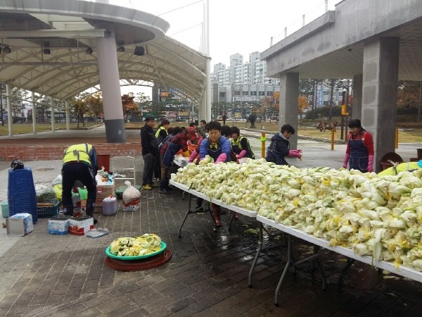 경기 양주시 회천2동 주민자치위원회는 최근 덕계공원 공연장에서 '사랑의 김장 나눔 행사'를 개최했다. 사진은 위원회 관계자들이 김장을 담기 위해 배추를 손질하는 모습.(사진제공=양주시청)