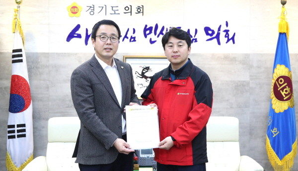 | ▲ 정기열 경기도의장이 경기도청공무원노조 유관희 위원장으로부터 '행정사무감사에 대한 건의사항'을 서면으로 전달받은 뒤 기념촬영을 하고 있다. | ||