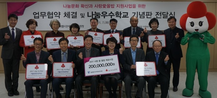 서울 강서양천교육지원청과 서울 사회복지공동모금회(서울 사랑의열매)는 지난 7일 오전 11시 강서양천교육지원청에서 '2017 사랑 愛 올밥 조식지원사업에 관한 협약식'을 진행했다. 사진은 협약 후 관계자들이 기념촬영을 하는 모습.(사진제공=서울 사회복지공동모금회)