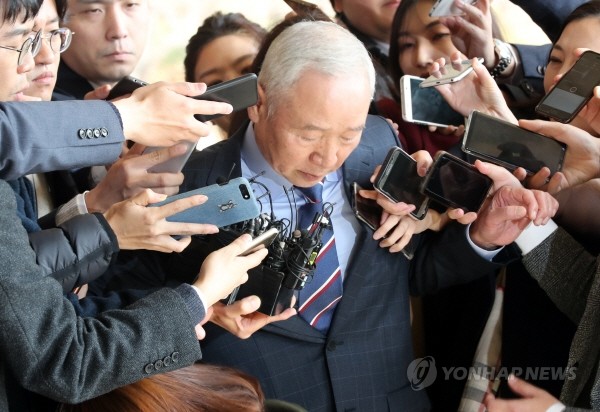 남재준 전 국정원장이 박근혜 전 대통령에게 특수활동비를 상납했다는 의혹과 관련해 피의자신분 조사를 받기 위해 8일 오후 서울 서초동 서울중앙지검에서 질문하려던 기자들을 뿌리치고 조사실로 향하고 있다.