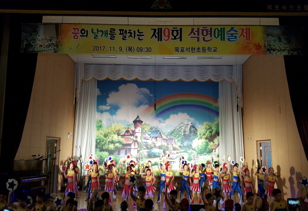 전남 목포석현초등학교 학예발표회인 석현예술제가 올해로 9회째를 맞이한 가운데 9일 오전 9시30분 '제9회 석현예술제' 무대에서 1학년 1·5반 학생들이 그동안 갈고닦은 실력을 뽐내고 있다.(사진제공=황승순 기자)