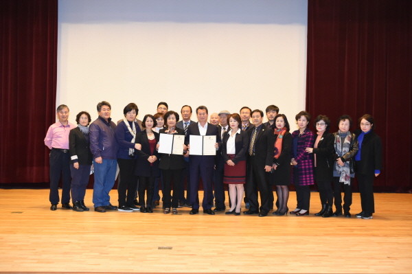 중랑구는 지난 8일 오후 복지사각지대 발굴 및 지원을 위한 ‘행복나누리 복지중개소’ 협약식을 개최했다. 사진은 나진구 구청장(가운데)이 관계자들과 기념촬영을 하는 모습.(사진제공=중랑구청)