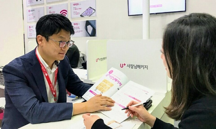 | ▲ LG유플러스 관계자가 ‘2017 서울 카페쇼’에서 카페 운영에 관심이 있는 고객을 대상으로 ‘유플러스 사장님 패키지’에 대해 설명하고 있다.(사진제공=LG유플러스) | ||
