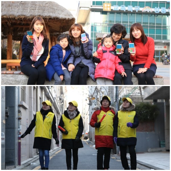 | ▲ (위)지역주민들이 ‘성동 안심귀가 앱’을 홍보하고 있다. (아래)‘여성안심귀가 스카우트’ 대원들이 지역내 취약지역을 순찰하고 있다.(사진제공=성동구청) | ||