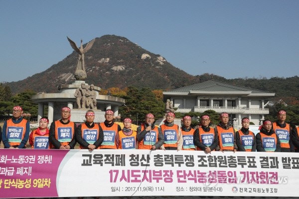 조창익 전국교직원노동조합 위원장이 9일 오전 서울 종로구 청와대 분수 앞에서 열린 '교육 적폐 청산 총력투쟁 조합원 총투표 결과 발표와 시도지부장 등 단식농성 돌입 기자회견'에서 여는 말을 하고 있다.