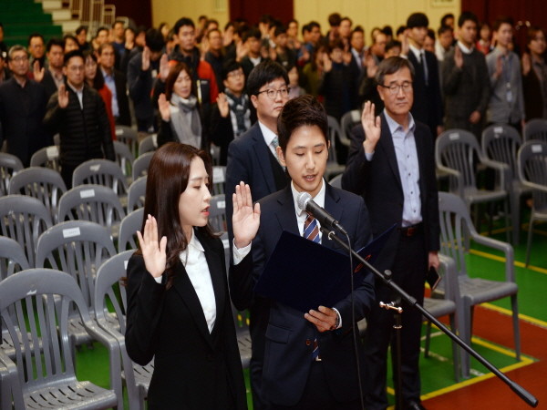 지난 9일 서울 동대문구가 구청 다목적강당에서 구청 직원·시설관리공단 직원 800여명을 대상으로 공무원 행동강령 실천 결의 선언과 청탁금지법에 관한 직원 특강을 실시했다. 사진은 ‘공무원 행동강령 실천 결의 선서’를 하고 있는 구청직원들의 모습.(사진제공=동대문구청)