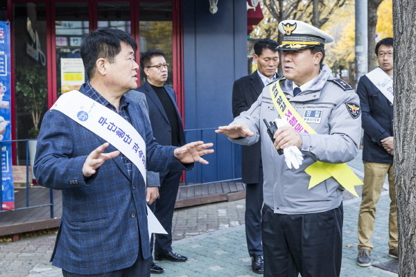 인천 계양구는 지난 9일 효성동 소재 효성남초등학교 앞에서 어린이 교통사고 예방 및 안전한 통학로 확보를 위한 ‘시민단체와 연계한 교통사고 줄이기(교통안전) 캠페인’을 실시했다. 사진은 캠페인에 참여한 박형우 구청장(왼쪽)이 경찰관과 이야기를 나누는 모습.(사진제공=계양구청)