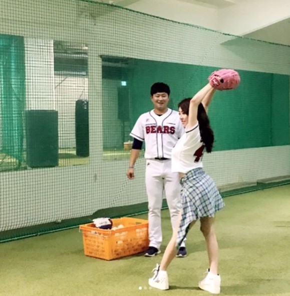 사진 속 설하윤은 두산 베어스 유니폼 상의를 착용하고 와인드업 자세를 취하고 있다. 활처럼 휘어진 설하윤의 몸매가 보는 이들의 시선을 강탈한다. 이현호 선수의 미소를 통해 시구지도 분위기를 짐작할 수 있다.