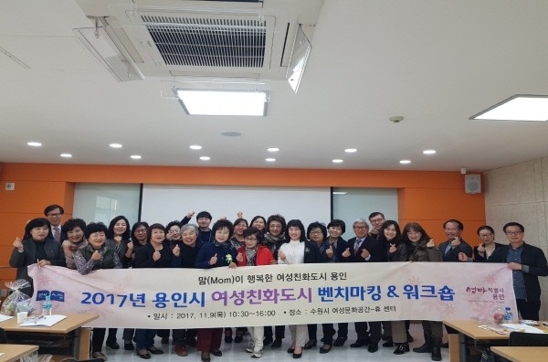 최근 경기 용인시는 수원시 권선구 권선동 소재 여성문화공간 ‘휴(休)센터’에서 여성친화도시 시민모니터단과 조성협의체 회원 30여명을 대상으로 워크숍을 개최했다. 사진은 워크숍 종료 후 모니터단과 조성협의체 회원 등이 기념촬영을 하는 모습.(사진제공=용인시청)