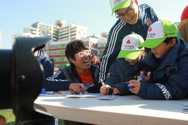 서울 사회복지공동모금회(서울사랑의열매)가 지난 11일 영서중학교축구장에서 미라클FC와 슈퍼스타즈FC가 함께하는 ‘사랑의 축구대회’를 개최했다. 사진은 대회에 참가한 표인봉·김용만씨가 아이들의 프로그램 진행을 돕고 있는 모습.(사진제공=서울사랑의열매)