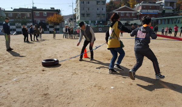 경기 부천시 부원초등학교는 지난 11일 토요일 부원가족캠프를 열어 그동안 가족간 부족했던 대화와 소통의 장을 마련했다. 사진은 캠프에서 열린 미니운동회에서 참여자들이 타이어를 끌고 한마음 달리기를 하는 모습.(사진제공=부원초등학교)