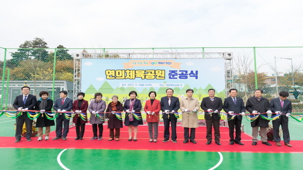 지난 13일 양천구 신정3동에서 지역주민들의 체력증진과 여가 선용을 위한 연의체육공원 준공식이 개최됐다. 사진은 준공식에 참석한 김수영 구청장(오른쪽에서 7번째), 전희수 구의회의장(오른쪽에서 6번째) 등과 관계자들이 테이프커팅식을 하고 있는 모습.(사진제공=양천구청)